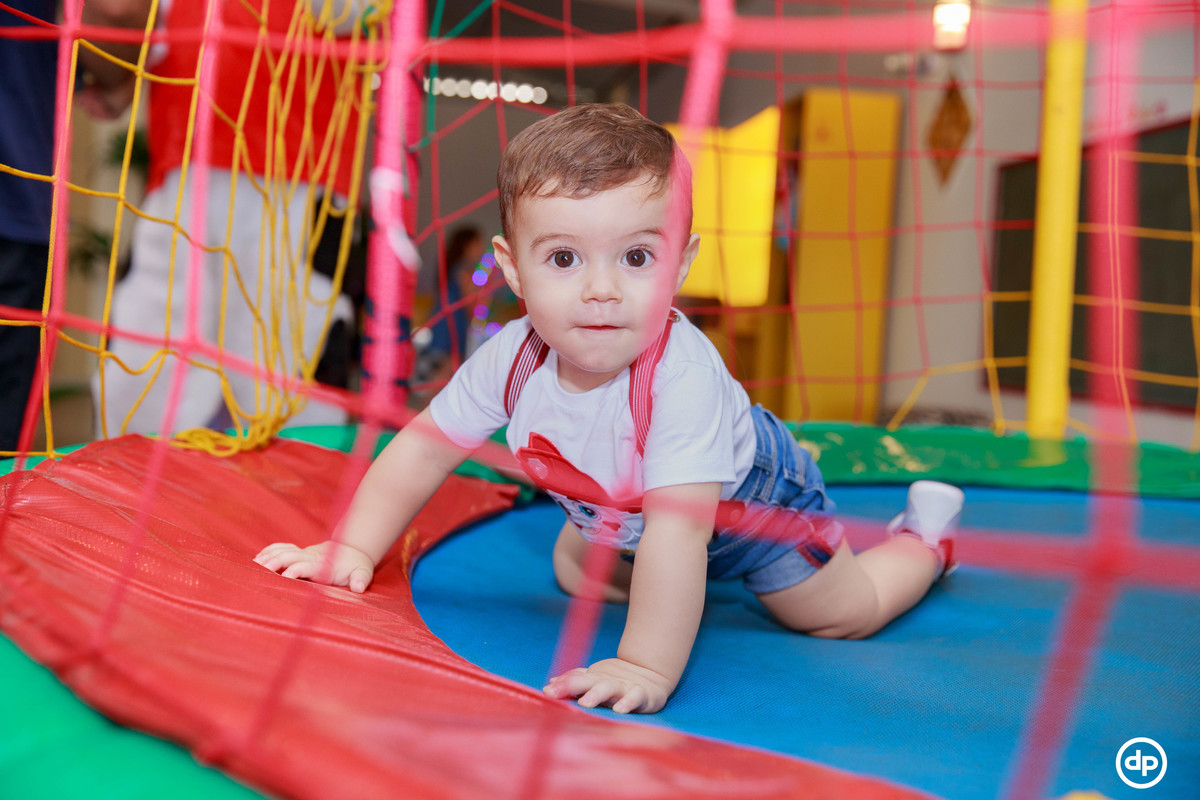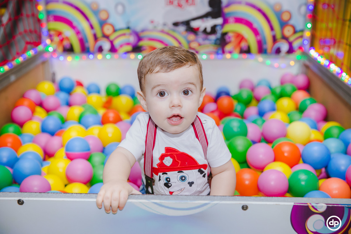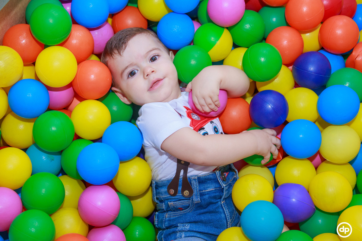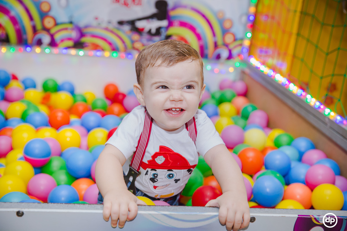 Uma família querida e cheia de amor. Um bebê sorridente e feliz, que aproveitou todos os detalhes de sua festa, mas se apaixonou pela piscina de bolinhas.